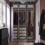 В гардеробе ПАКС вы сможете хранить много вещей на малой площади. Здесь есть платяные штанги для короткой и длинной одежды на плечиках, вентилируемые корзины, а также ящики и выдвижные полки, пространство которых можно оптимизировать с помощью