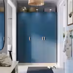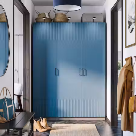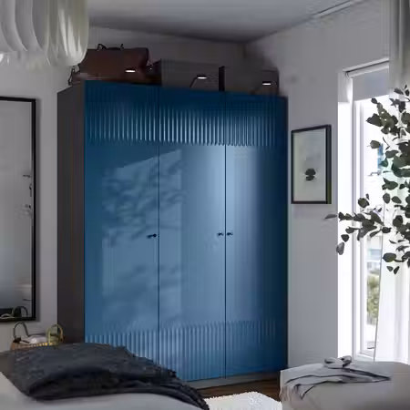 Глубокий синий цвет и утончённая гравировка придают дверце FYRUDDEN первоклассный вид. Она превосходно сочетается с мебелью из серии RÅDMANSÖ, поэтому вам будет очень легко оформить спальню в едином стиле. Глубокий синий цвет идентичен цвету всех задних панелей и внутренних элементов ящиков мебели RÅDMANSÖ, за счёт чего комбинации будут выглядеть динамично и гармонично. Дверцу можно сочетать с каркасом PAX белого, серо-бежевого или тёмно-серого цвета.