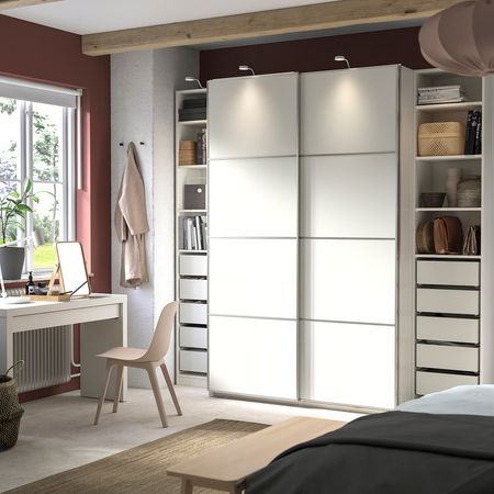 Если вы хотите дополнить каркас гардероба ПАКС раздвижными дверьми, высота потолка должна быть минимум 242 см.