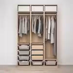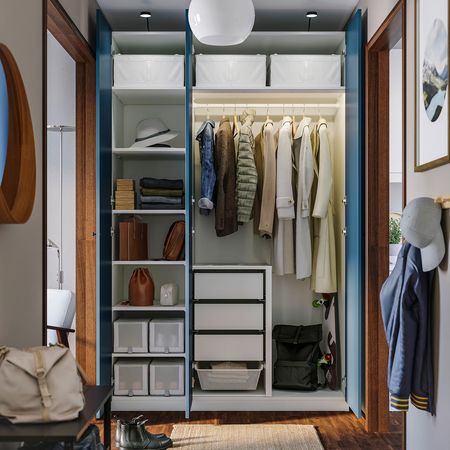 В гардеробе ПАКС вы сможете хранить много вещей на малой площади. Здесь есть платяные штанги для короткой и длинной одежды на плечиках, вентилируемые корзины, а также ящики и выдвижные полки, пространство которых можно оптимизировать с помощью