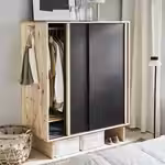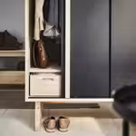 В тесном пространстве не обойтись без продуманных решений для хранения. В этом гардеробе есть платяная штанга для рубашек и платьев, полка для сложенной одежды, обуви и сумок, а также зеркальная дверца, так что вешать отдельное зеркало