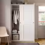 Раздвижные дверцы позволяют экономить место, а внутри можно хранить одежду как на плечиках, так и в сложенном виде.