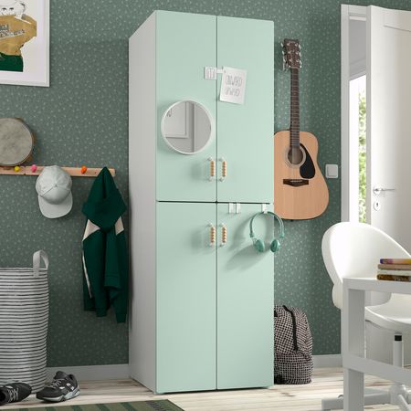 Детская одежда часто валяется бесформенной кучей на полу или на дне гардероба? Ничего удивительного! Малышам развешивать вещи на плечики слишком трудно, а детям постарше — просто неохота. Вот для чего мы разработали модуль с выдвижным ящиком СМОСТАД, при создании которого ориентировались на возможности детей. В таком модуле все на виду, и до каждой висящей на крючке вещи легко дотянуться с двух сторон. Это удобно как совсем малышам, так и детям постарше.