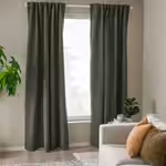Блокирующая свет гардина РОСЕНМЭНДЕЛ из темно-зеленой ткани, похожей на шерсть, с меланжевой расцветкой создает спокойную обстановку в гостиной или спальне и не выглядит слишком тяжелой.