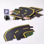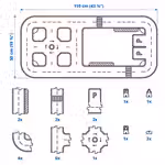 В набор входит: 17 фрагментов дорожного полотна разной формы и 3 дорожных знака с опорами для фиксации.