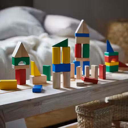 С помощью 40 кубиков из массива дерева ребенок в игровой и творческой форме научится различать цвета и геометрические фигуры.