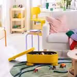Практичное решение для хранения небольших игрушек, пультов или запасного пледа — пуф вмещает много вещей, и уборка с ним будет проходить проще и быстрее.