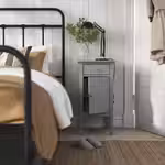 Эта прикроватная тумба с длинными коническими ножками, которые придают ей воздушности, хорошо сочетается с высокими кроватями, а ещё под ней легко мыть пол.