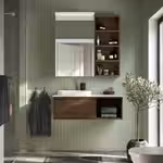 Открытый шкаф HAGAÅN под дерево наполняет ванную комнату теплой расслабляющей атмосферой.