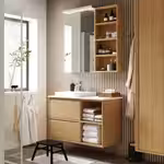 Открытый шкаф HAGAÅN под дерево наполняет ванную комнату теплой расслабляющей атмосферой.