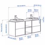 В комплект входит: 2 шкафа под раковину с ящиками, 1 открытый шкаф, 1 столешница, 2 полуутопленные раковины, 2 сифона и 2 смесителя.