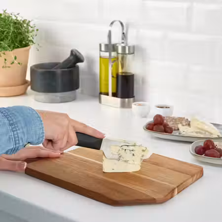 Эта прочная разделочная доска бережно относится к ножам и не нуждается в сложном уходе, так что ее можно класть в посудомоечную машину.