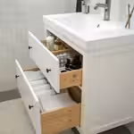 В глубоком нижнем ящике удобно хранить полотенца и фен, а в верхнем ящике достаточно места для бутылочек с шампунем и гелем для душа и разных мелочей.
