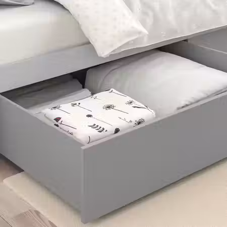 Под кроватью можно разместить ящики — отличное решение для хранения подушек и одеял.