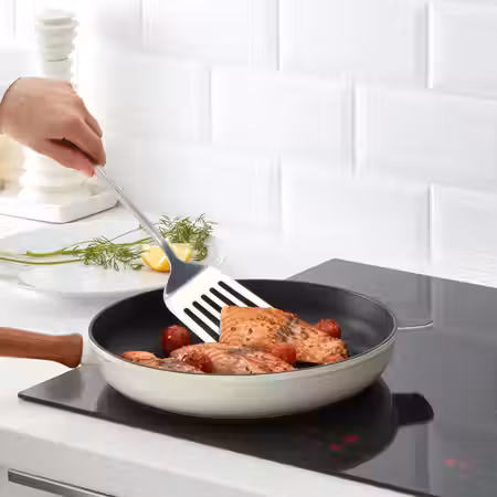 Сковорода нагревается очень равномерно и эффективно, поэтому для достижения наилучших результатов выбирайте средний уровень нагрева.