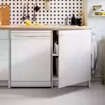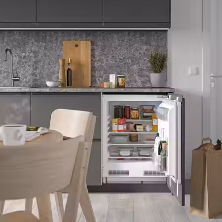 Матовые фасады кухонных шкафов УППЛЁВ бежевого цвета выполнены в утонченном современном стиле и дополнены скошенными краями и встроенными ручками в тон.