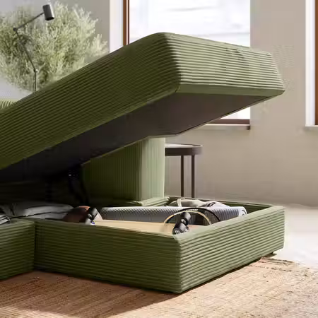 Вместительное пространство внутри модулей козетки и сиденья прекрасно подходит для хранения пледов, игр и коробок с мелкими предметами.