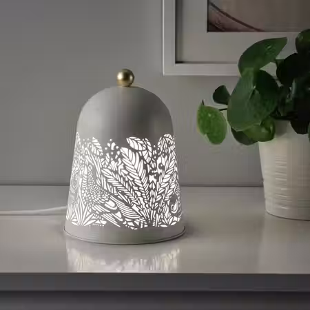 Настольная лампа СОЛЬСКУР с нежным перфорированным орнаментом с изображениями птиц и растений — просто идеальное решение для создания романтической атмосферы.