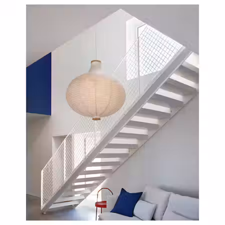 Благодаря таким материалам, как рисовая бумага и светлый березовый шпон, этот абажур смотрится очень естественно.