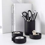 В набор входит: 1 стакан для ручек (диам. 8 см, высота 10,5 см), 2 контейнера (диам. 8 см, высота 3 см) и 1 диспенсер для клейкой ленты (диам. 8 см, высота 3 см).