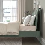 Мягкая серо-зеленая ткань «кульста» в полоску придает кровати особый характер, и на детали каркаса нанесено порошковое покрытие в тон ткани.