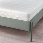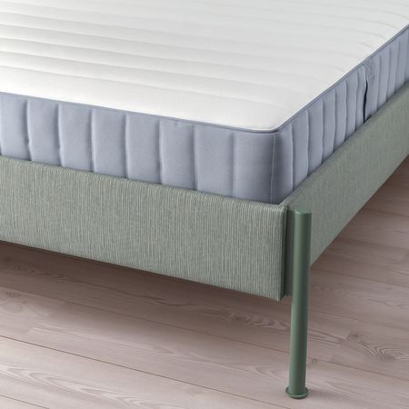 Мягкая серо-зеленая ткань «кульста» в полоску придает кровати особый характер, и на детали каркаса нанесено порошковое покрытие в тон ткани.