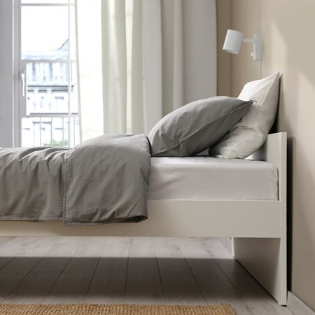 Изголовье из натуральных волокон не только защищает стену, но и смягчает строгий дизайн каркаса кровати ВЕВЕЛЬСТАД.