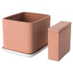 В набор входит: 1 кашпо (длина 22 см, ширина 19 см, высота 18 см), 1 контейнер для воды с крышкой (длина 17 см, ширина 6 см, высота 15 см) и 1 поддон (длина 24 см, ширина 20 см, высота 3 см).