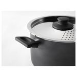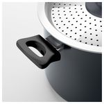 Крышка с защелкой, благодаря которой легко слить воду через отверстия в крышке. Благодаря удобным ручкам посуду легко поднимать и переносить. Толстые стенки и дно равномерно распределяют тепло. Сделано из алюминия.
