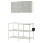 Серия ЭНХЕТ — это комбинации мебели даже для маленькой кухни. Здесь есть место на открытых полках и за глухими фасадами вдоль столешницы, размер которой позволяет разместить портативную варочную панель и кофеварку.