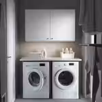 Навесное решение для закрытого хранения в сочетании со специальной нишей для стиральной и сушильной машины или бельевых корзин поможет вам обустроить аккуратный интерьер.