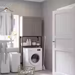 Аккуратное решение со специальным пространством для стиральной машины или бельевых корзин и вместительным решением для хранения сверху.