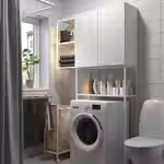 В этом решении предусмотрены специальные места для хранения, а также закрытый шкаф для моющих средств, которые часто загромождают свободное пространство, и открытые полки для удобного хранения предметов повседневного пользования.
