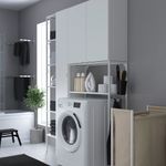 В набор входит: шкаф, каркас с полками для стиральной машины, ручки и мешок для белья на колесиках, крючок и контейнер.