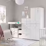 Здесь можно хранить по рукой все необходимое — от подгузников и кремов до одежды и игрушек. А когда малыш повзрослеет, пеленальный столик можно будет превратить в письменный стол, за которым он будет делать уроки, рисовать и