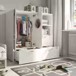 Гардероб для одежды, открытые полки для книг и выдвижные ящики для больших и маленьких предметов.