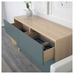 Благодаря доводчикам ящики и дверцы закрываются плавно и бесшумно. Ножки придают комбинации БЕСТО более легкий вид, поднимая модули на полом. Кроме того, это упрощает уборку. Два ящика и полки за дверцами обеспечат достаточно места для хранения.