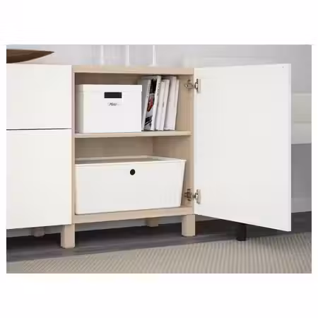 Комбинируйте открытое и закрытое хранение в зависимости от потребностей. Благодаря интегрированному нажимному механизму ящики и дверцы открываются легким нажатием. Регулируемые ножки позволяют скорректировать неровности пола.