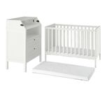 В набор входит: 1 детская кроватка СУНДВИК белого цвета (внешний размер 125x67x85 см), 1 пеленальный стол/комод СУНДВИК белого цвета (108x79x51 см, глубина ящика 46 см) и 1 матрас для детской кроватки КРУММЕЛУР (60x120x8 см).