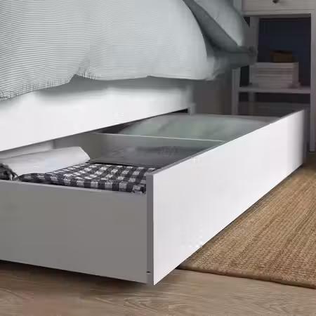 Чтобы расширить возможности для хранения, добавьте вот такой комплект из прикроватной тумбы и комода.