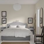 Каркас кровати с обивкой ХАУГА с мягким изголовьем выполнен в неизменно актуальном стиле и украшен классическими элементами декора. Мягкая ткань Висле сделана из переработанного полиэстера.
