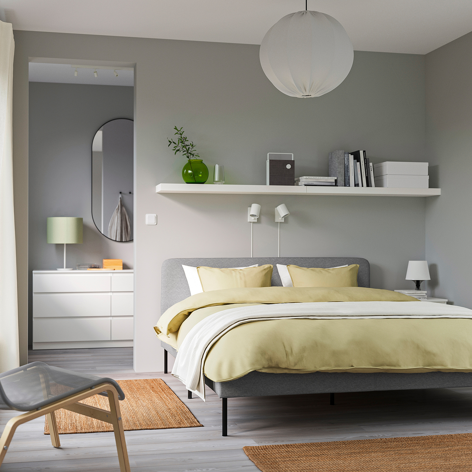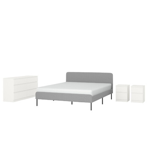 Каркас кровати СЛАТТУМ и комод КУЛЛЕН выглядят просто и лаконично, поэтому они прекрасно смотрятся вместе. Удобный каркас кровати с обивкой, две прикроватные тумбы и комод помогут вам обустроить гармоничный интерьер в едином стиле.