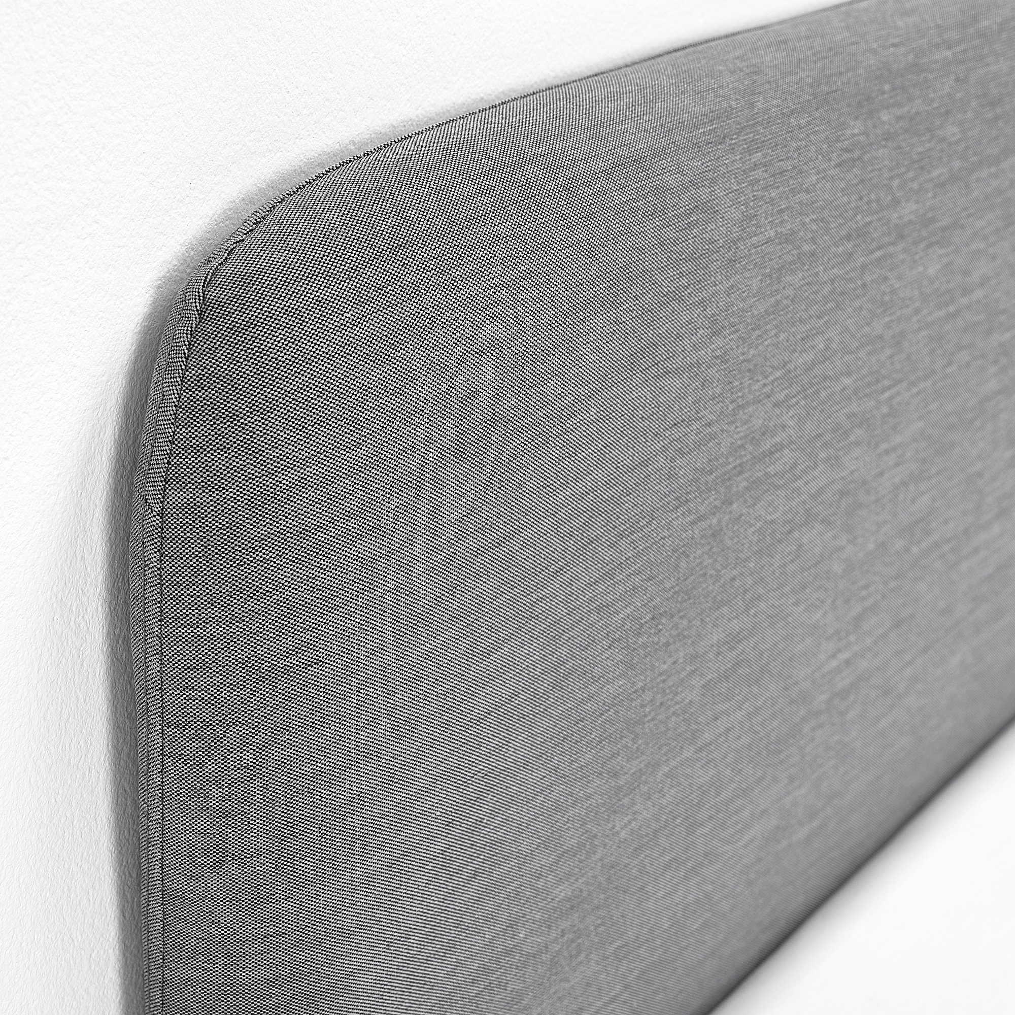 Каркас кровати СЛАТТУМ обтянут мягким тканым полотном и дополнен изящной прострочкой на изголовье и изножье.