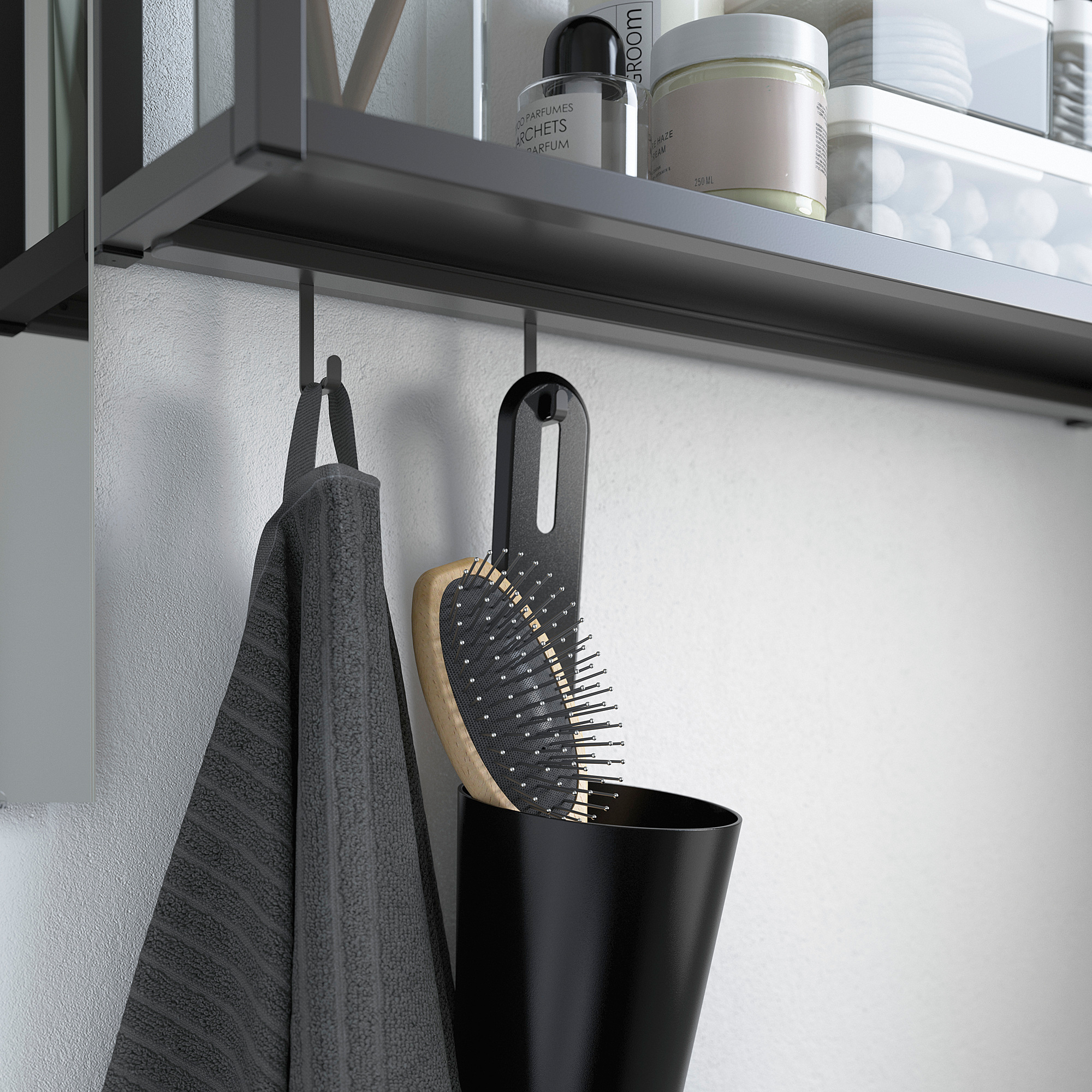 Идеально продуманное решение объединяет открытое и закрытое хранение. Зеркало позволит увидеть себя и все ваши вещи. Благодаря настенному каркасу и крючкам, для установки которых не нужно сверлить отверстия, полотенца и аксессуары всегда будут под рукой.