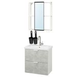 В набор входит: шкаф, подвесное зеркало, ручка, ножка, раковина, сифон, смеситель, крючок и контейнер.