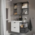 Настенный каркас дополнен раздвижным зеркалом, к которому можно подойти к вплотную. В тумбе внизу достаточно места для хранения, а контейнер и самоклеящиеся крючки не требуют сверления и обеспечивают порядок вокруг раковины.
