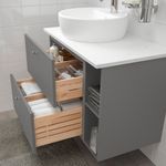 В глубоком нижнем ящике удобно хранить полотенца и фен, а в верхнем ящике достаточно места для бутылочек с шампунем и гелем для душа и разных мелочей.