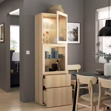 Стеклянная полка отлично подходит для красивой демонстрации аксессуаров в сочетании с подсветкой внутри гардероба ПАКС, а также для хранения вещей наверху — снизу видно содержимое.