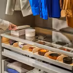 Стеклянная полка отлично подходит для красивой демонстрации аксессуаров в сочетании с подсветкой внутри гардероба ПАКС, а также для хранения вещей наверху — снизу видно содержимое.
