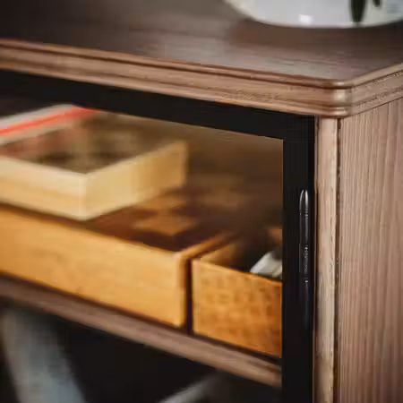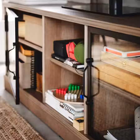 С тумбой ЛАНЕСУНД с отделением для хранения за стеклянными дверцами пространство вокруг телевизора всегда будет выглядеть аккуратно.